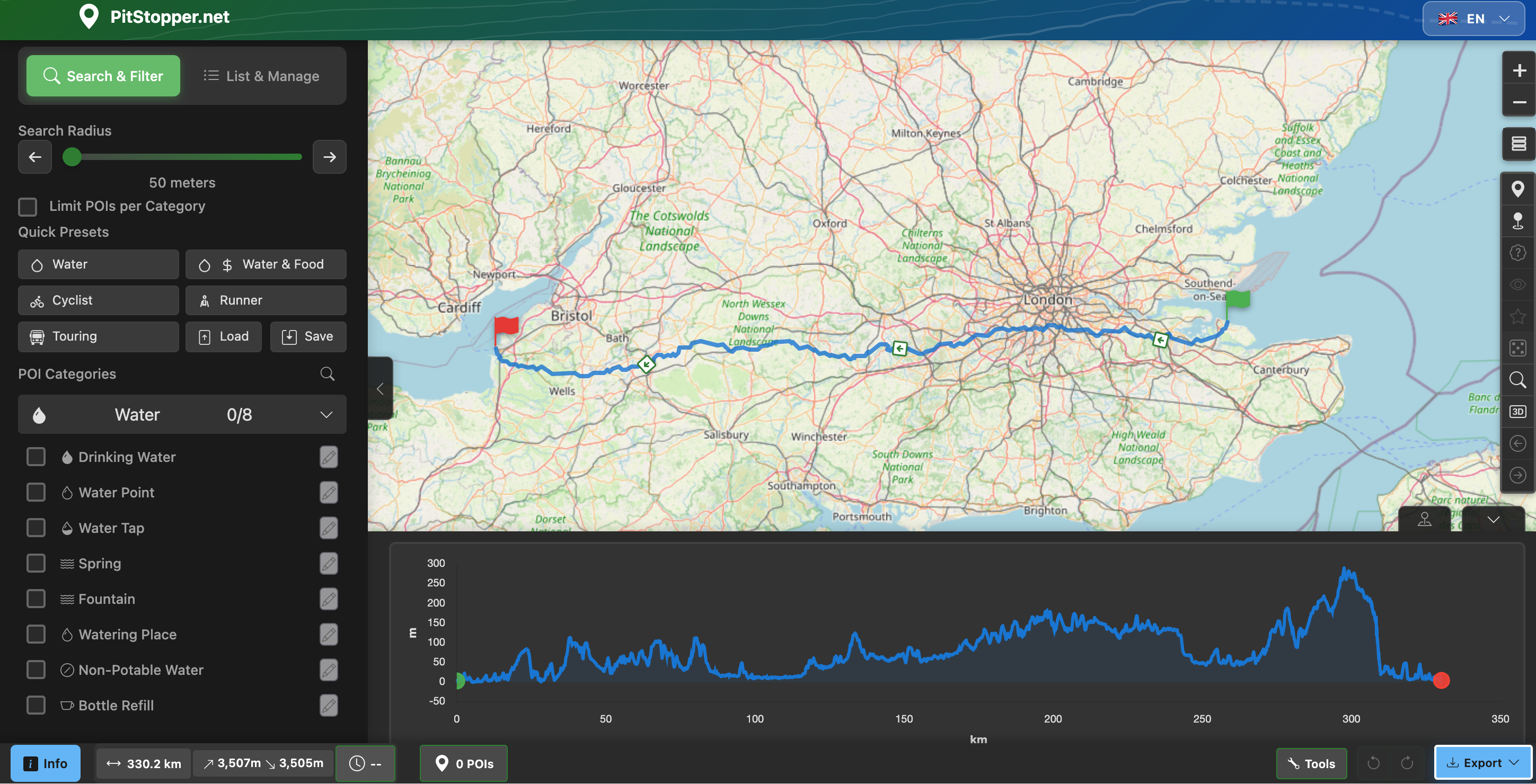 Your route is displayed on the map with an elevation profile at the bottom showing climbs and descents. The left sidebar contains categories of points of interest you can search for - water, food, accommodation, services, and more.