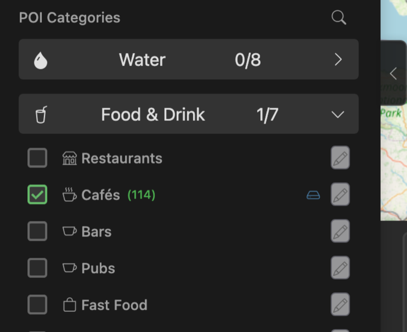 - Search 60+ POI categories - water, toilets, bike shops, B&Bs...