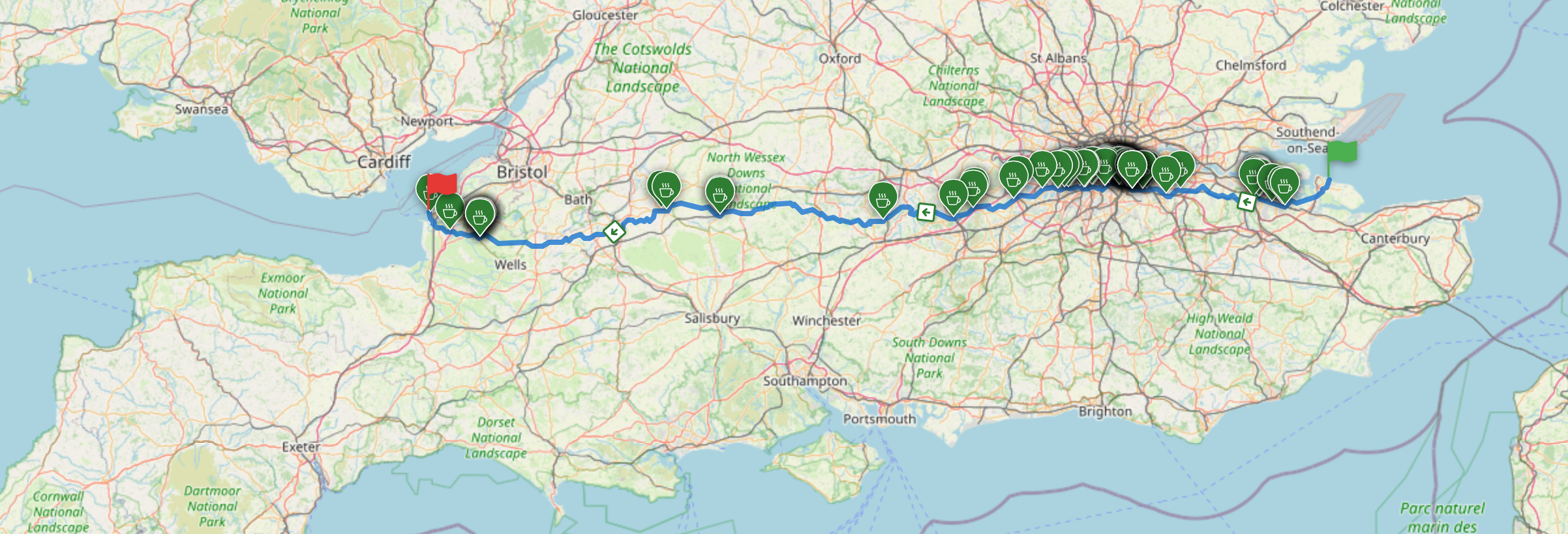 In this walkthrough, we'll use the famous Chase the Sun route - an epic ride from the east coast to the west coast of southern England, completed between sunrise and sunset on the longest day of the year. Let's find some cafes along the way!