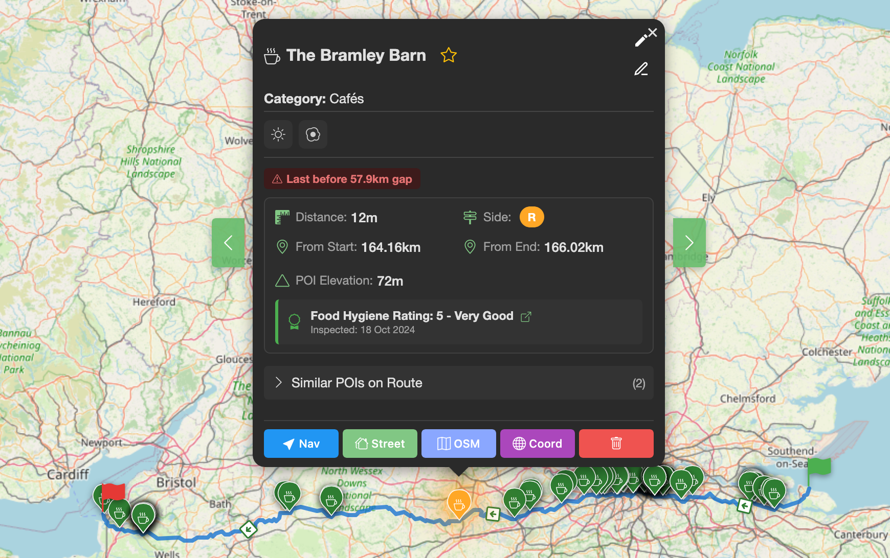 Click any marker to see detailed information: the name, how far along the route it is, distance from the track, and for UK food establishments, the food hygiene rating is automatically fetched. You can also add personal notes, mark favourites, or view the location in Google Maps or Street View.